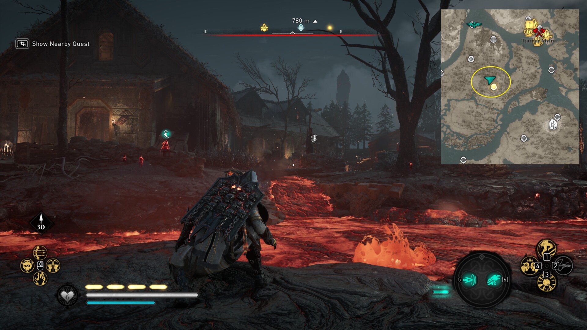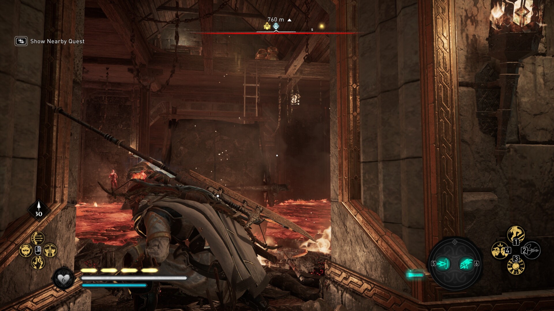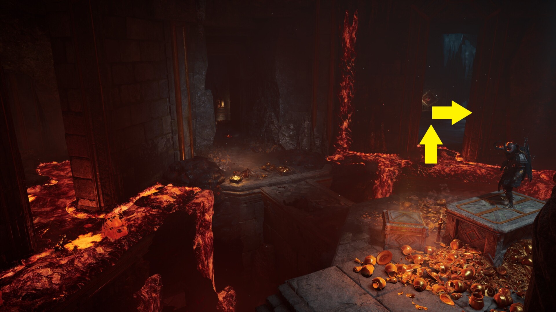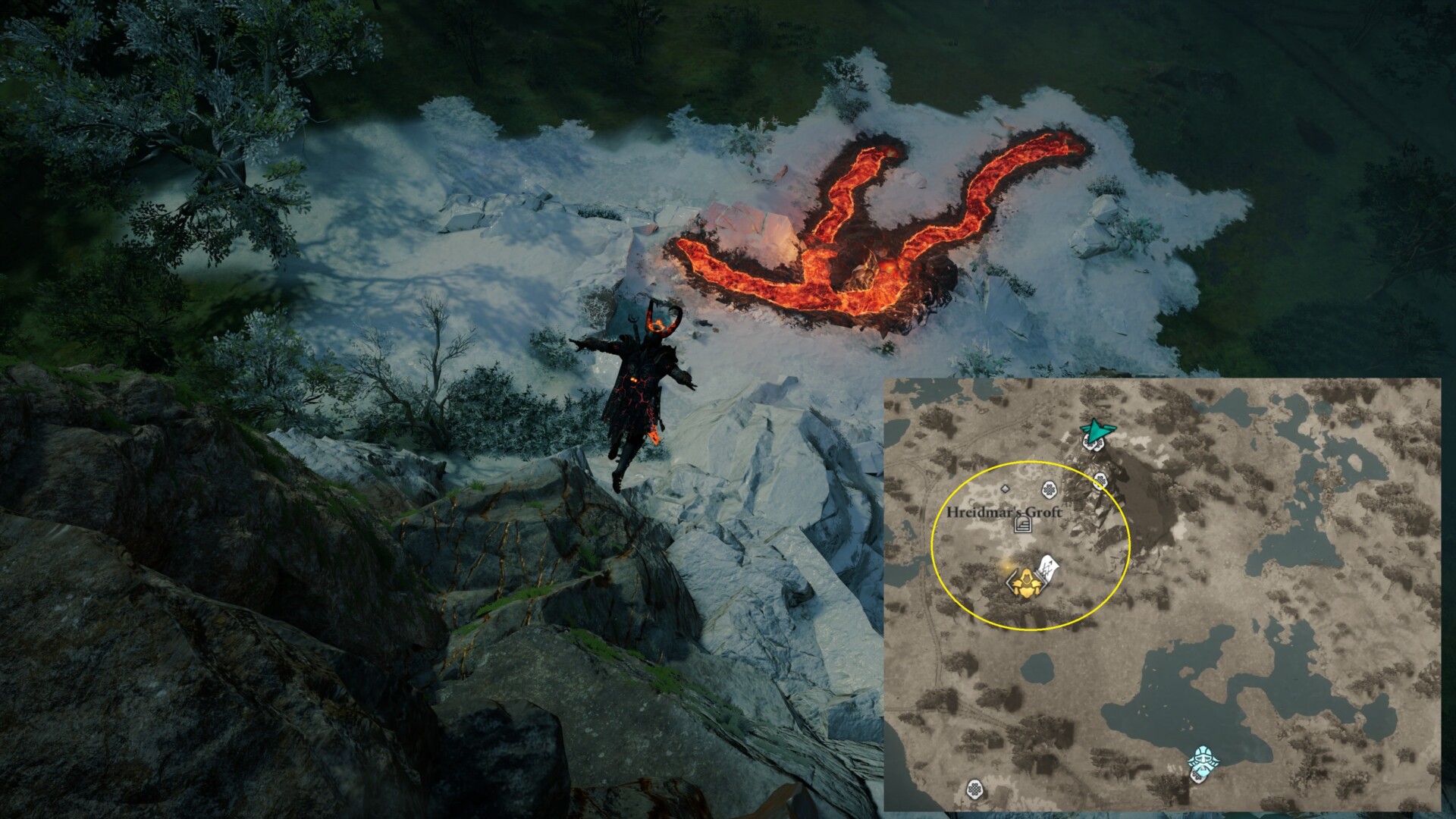 Tag the fast travel point and look down below to see a lava flow. Jump down and check a spot near it to find a breakable ice floor.