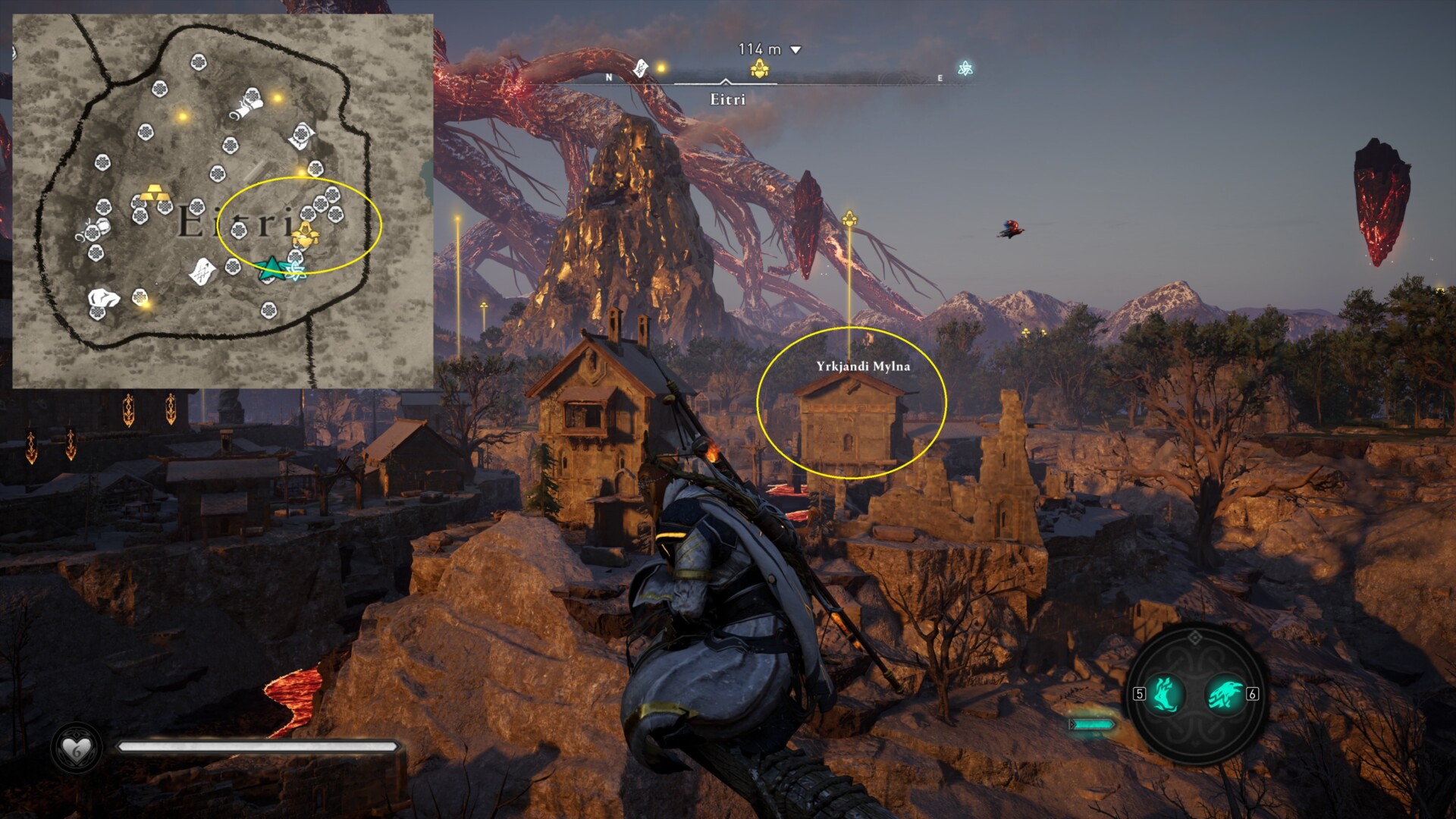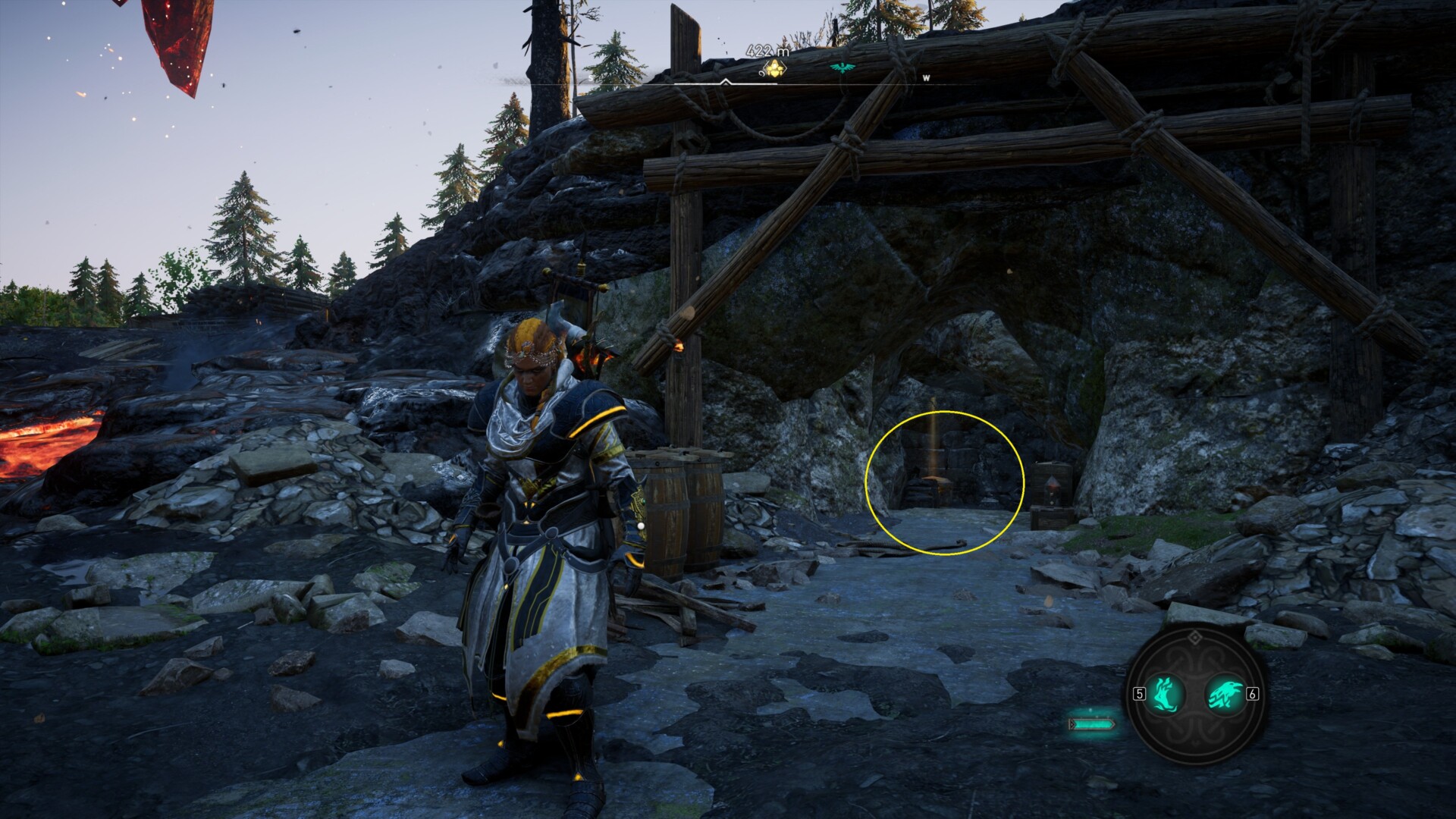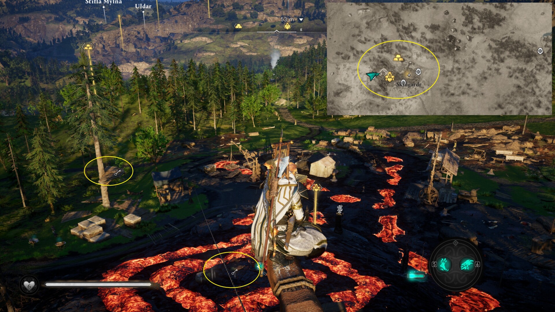 - One of the keys is in the middle of the lava flows. You can use the zipline to move across before dropping down in the center of that section. You don’t need to activate the Power of Muspelheim here since you can just press the dodge/roll key repeatedly. Eivor will skip on the ground to minimize the damage.