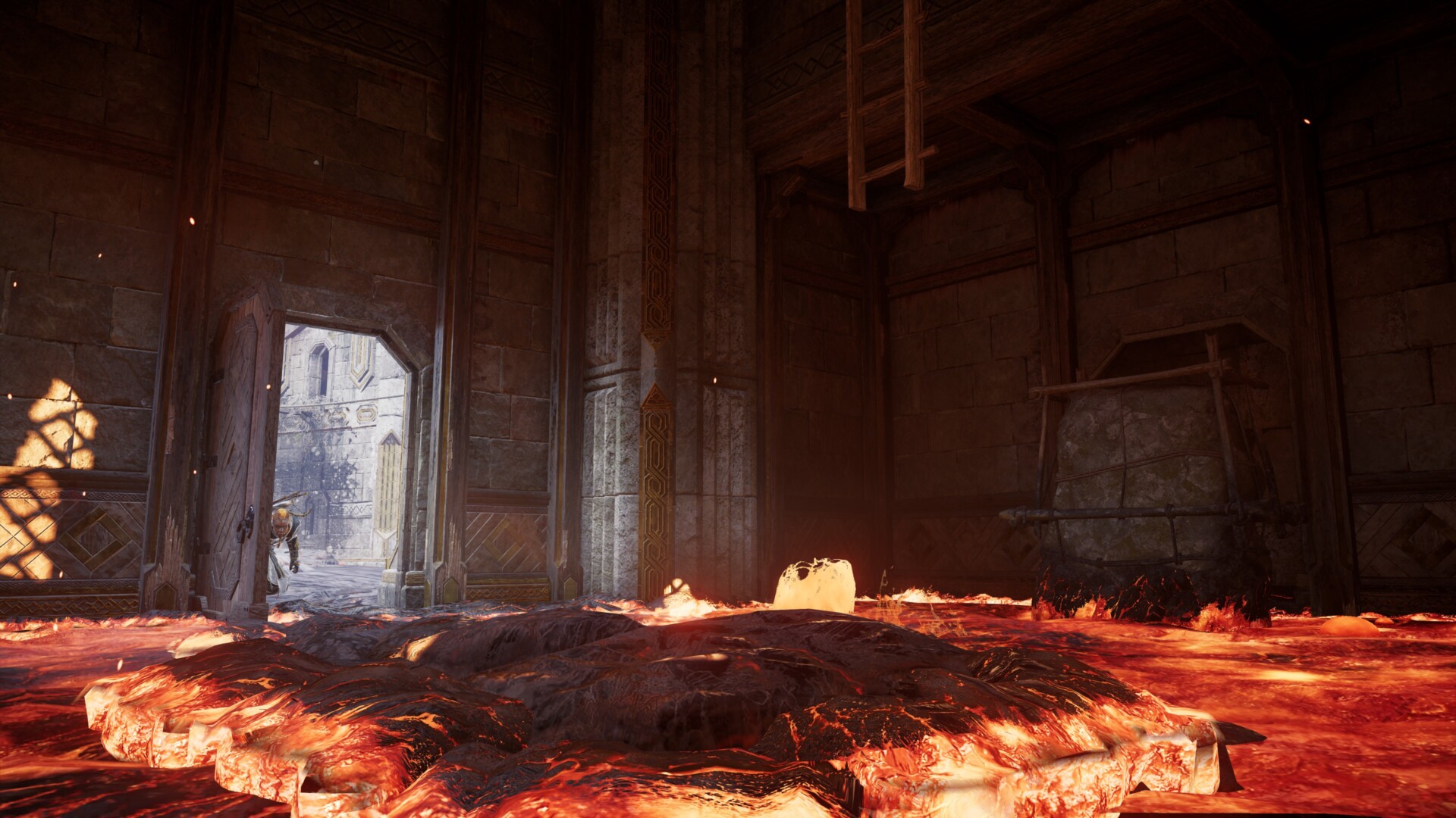 Enter the building and activate the Power of Muspelheim. You’ll be able to walk on lava and pull the shelf until it’s underneath the ladder. You can then climb the ladder to find the item up top.