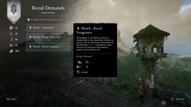 Note 2: If you check the Trade Posts in Drumlish (Meath), Athlone (Connacht), and Dysert (Ulster), you can upgrade the Raider Tents by using supplies. Doing so will provide bonus rewards when you complete Royal Demands in their respective regions.