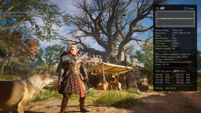 The benchmark tool is one way to gauge performance, but you can also pop up Assassin’s Creed Valhalla‘s performance panel (“F1”) while playing. This shows your framerates (including a graph for the last few minutes of your playtime), CPU and GPU utilization, and GPU temperature. It’s a neat touch, but it can be a little distracting especially when you’re in the middle of duking it out with various soldiers.