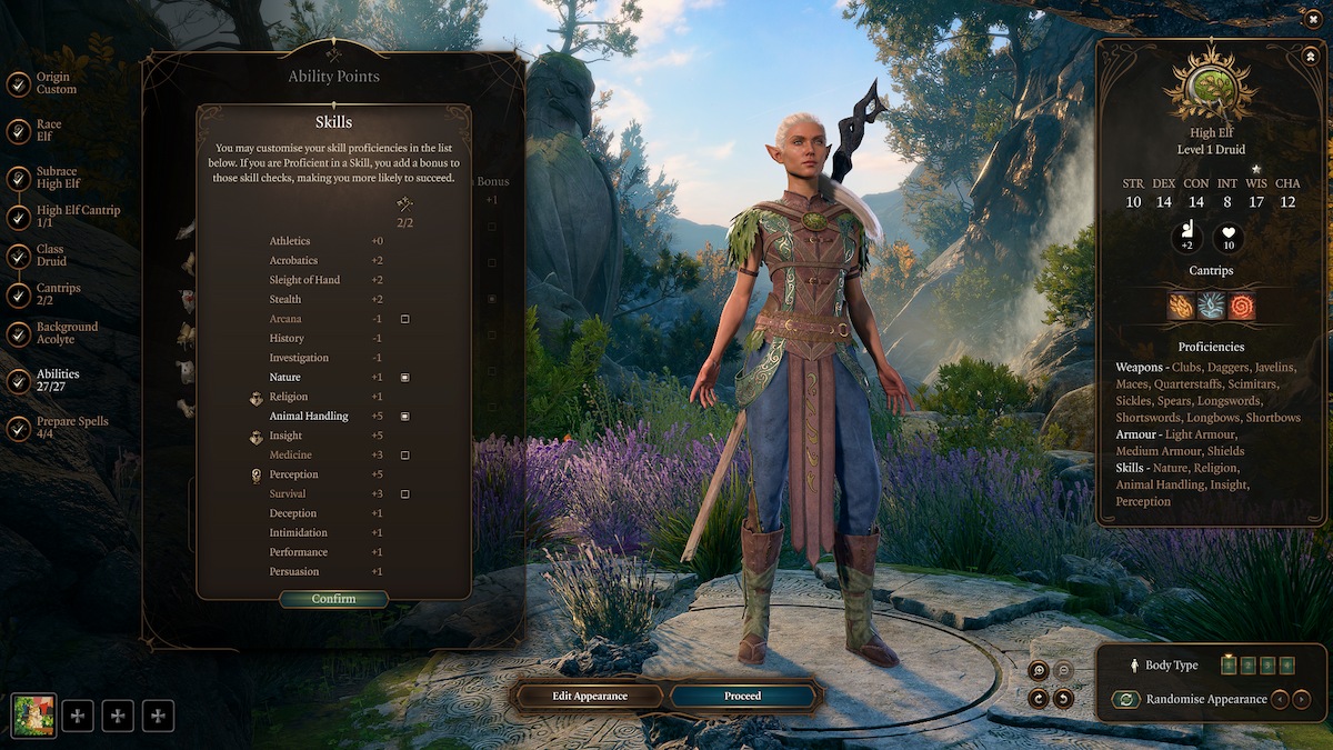 As stated previously, Larian Studios changed the skills you can be Proficient in to align with your class. Now, this makes it easier for you to be any race you want when become a Druid. You can also decide on your ability scores, which we’ll detail below.