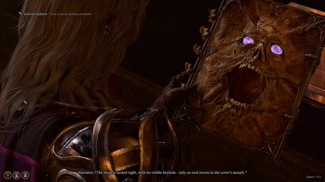 Now a word of warning before attempting to open this book. Once you place the Amethyst in the slot and open it up, you’ll need to pass various skill checks to keep reading. The first will have a DC of 10, the next will be 15, and finally, the last option will be a 20. If you fail any of these throws, the book will remain permanently shut. So if you want to see the outcome of successfully rolling each time, it may be best to employ that save button. After reading the book successfully, you’ll get an effect called Necromancy of Thay which lets you use Speak with Dead once a day.