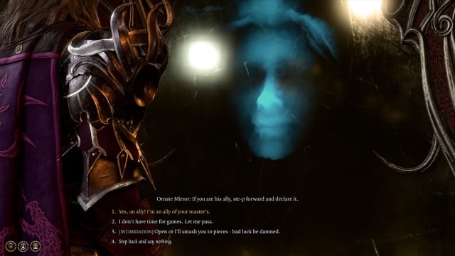 Once the fight is over, head to the north side of the cave, behind a pillar of rock. On the ground, you should see a Dark Journal. Read it and we’ll discover that this area was inhabited by a necromancer named Ilyn Toth. Now head to the southwest side of the room where you’ll find an Ornate Mirror. This is actually a magic mirror, and it hides another room with even more goodies. However, to pass you need to either answer its questions correctly or pass an Intimidation check. If you want to answer its questions correctly, here are the choices you need to pick.