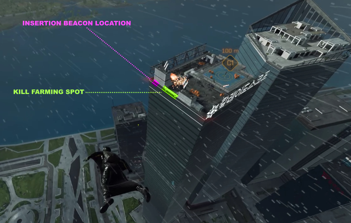 An alternative is to use a helicopter to fly up to the location and then jump out when directly above it. This requires decent piloting skills, although with practice it is a consistent method. Finally, those that prefer staying on the ground can take the elevator up to the top of the building and quickly run to the marked location. To do this, it is best to use Irish due to his Veteran passive ability providing armor and allowing you to tank more shots on the way.