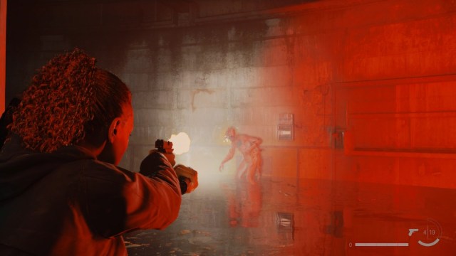 Once you hit the power button, the room will change drastically. The water’s gone, and you can now head down the stairs to the lower level. Cynthia will now be out and available for you to shoot. Remember to Flashlight Boost her to remove her darkness shield.
