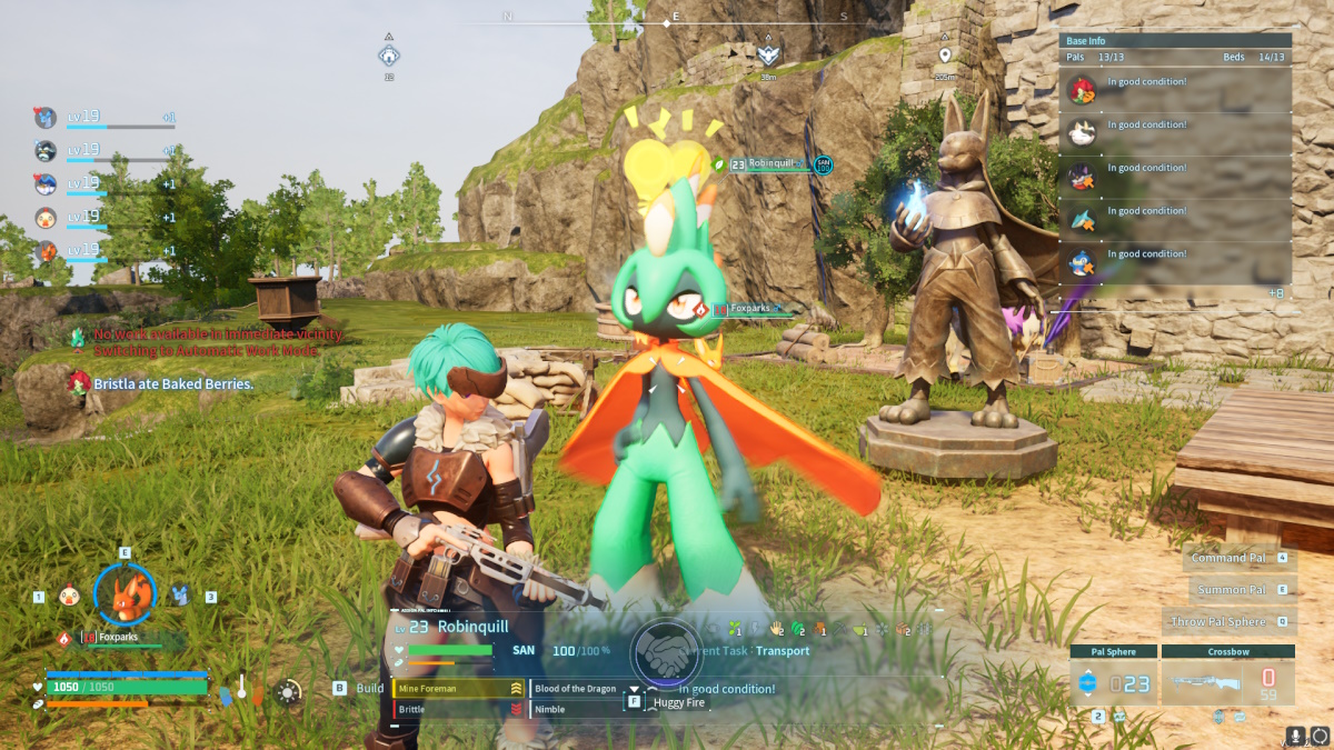 Filling your base with Pals that excel at specific tasks is efficient, but having one jack-of-all-trades can be helpful. Robinquill can do almost everything and has Transporting LV2. Even if Robinquill doesn’t always complete tasks, it wanders near stations and transports the resources into boxes. If you’re tired of walking over piles of stones and becoming immediately over-encumbered, this is the Pal for you.