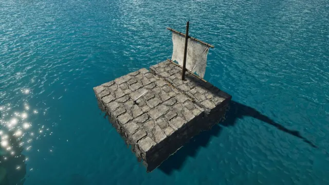 To make the Raft Base which you can build up and take anywhere on the water since it is fully mobile, you need to perform a little base-building game break. From the rudder, build Wood or Stone Foundations on all the corners by putting them as far onto the corners as possible and sinking them as much as possible. Create a “U” shape and then pick up the Foundations except for the three on the sail’s side.