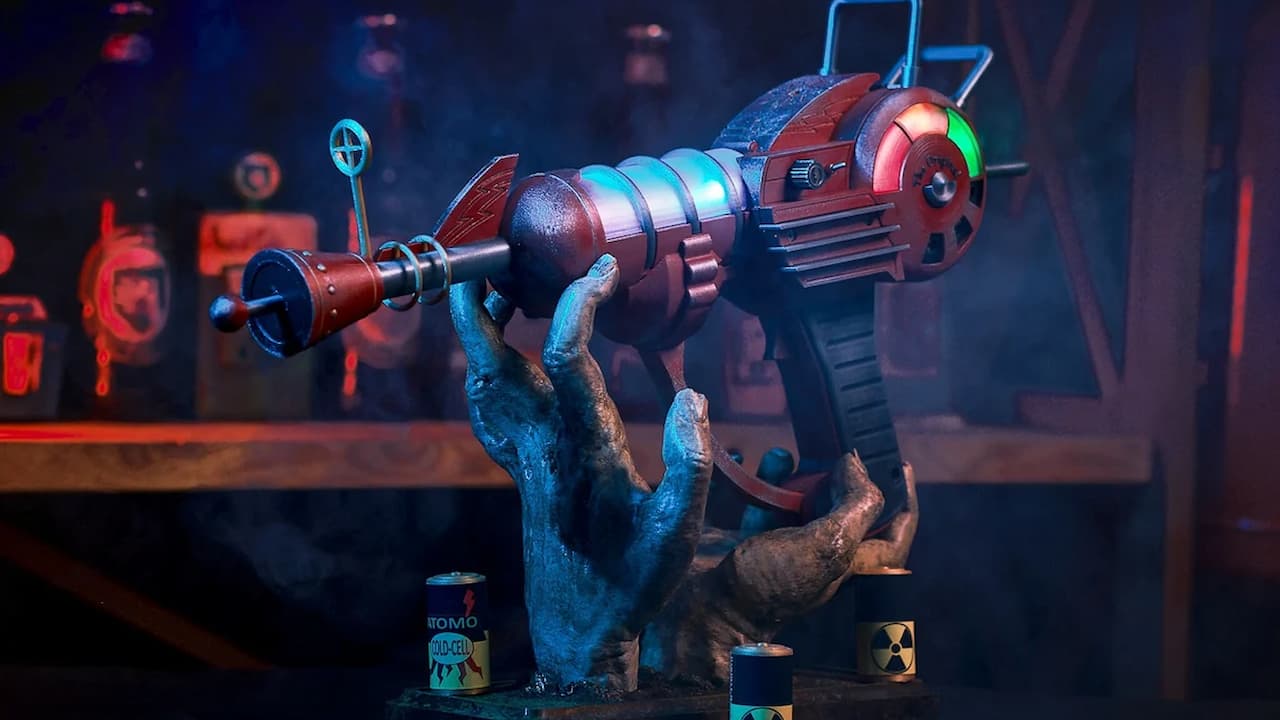 The gun itself fits perfectly in hand as a 1:1 replica of the original with light-up LEDs. The craftsmanship is impeccable and results in a high-quality feeling Ray Gun. Spend a little more for the zombie’s hands stand, to boot.