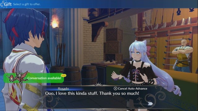 When you give Rosado gifts, keep in mind his interest in leisure pursuits outside combat. He appreciates the Strong Perfume, Quality Kerchief, Flower Wreath, Cute Apron, Antler Earrings, and Lovely Candle. Avoid giving him difficult reading materials or gifts you might typically associate with warriors obsessed with combat.