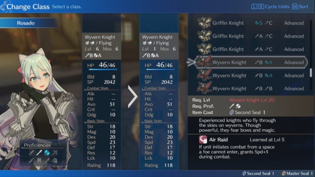 Rosado first joins your party as a Wyvern Knight. This class is capable of moving a long way each turn, and has little to fear from most units that mount physical attacks. He may spend his time at The Somniel talking about cuteness, but he turns serious the minute he enters a battlefield.