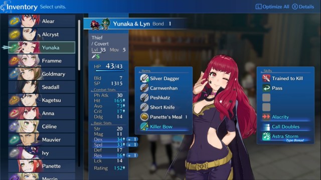 As Yunaka inherits abilities, focus on the ones that improve her Dexterity or Avoid ratings. If you plan to stick with knives, consider learning Knife Precision 5 from Leif. Lucina imparts the Dexterity +5 skill, which is also useful and a nice complement to Yunaka’s existing strengths. Finally, the Perceptive+ and Lunar Brace+ skills ensure that when Yunaka attacks first, she hits extra hard.