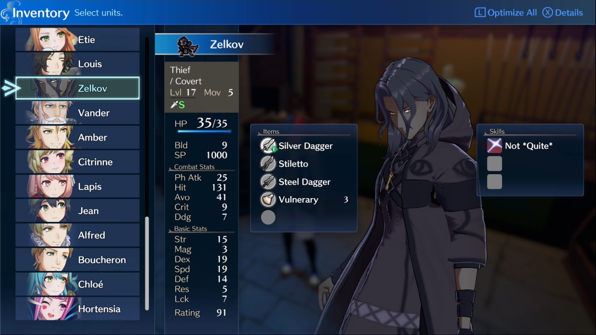 Pair Zelkov with an Emblem that plays to his considerable existing strengths. Leif is a good option, plus you’ll want to bond with him anyway because Leif imparts the Knife Precision 5 ability once you have nearly maximized your bond. Another good option is Marth, who teaches the Avoid +30 ability.