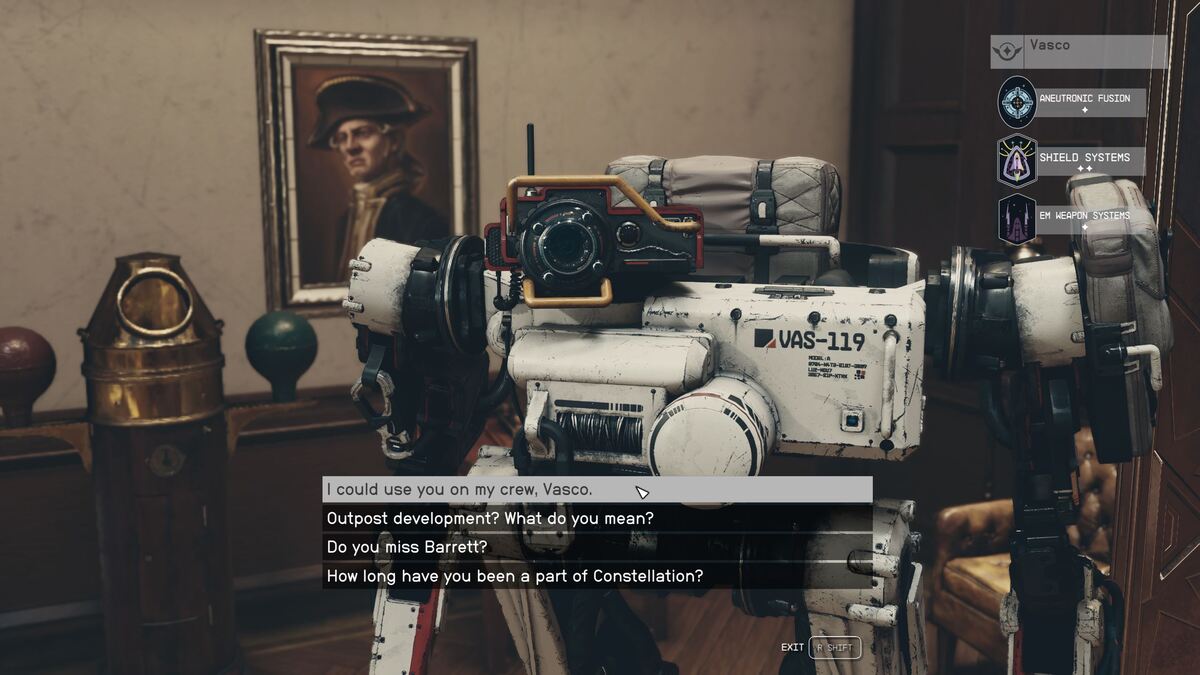 I love Vasco because I genuinely think he’s funny and most importantly not annoying. He’s fairly competent in combat and Vasco is the only companion you can have that doesn’t hurt you if you have the Introvert Trait because the description of the Introvert Trait specifies “human companions” and Vasco is a robot. His biggest downside is he’s a bit bulky and the fact that every single one of his skills works to benefit you when he’s assigned to the ship.