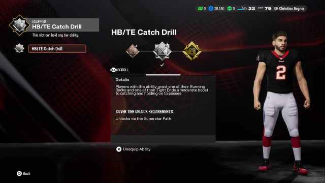 | HB/TE Catch Drill | Players with this ability grant one of their Running Backs a moderate boost to catching and holding on to passes. | Players with this ability grant one of their Running Backs and one of their Tight Ends a moderate boost to catching and holding on to passes. | Players with this ability grant one of their Running Backs and two of their Tight Ends a moderate boost to catching and holding on to passes. |