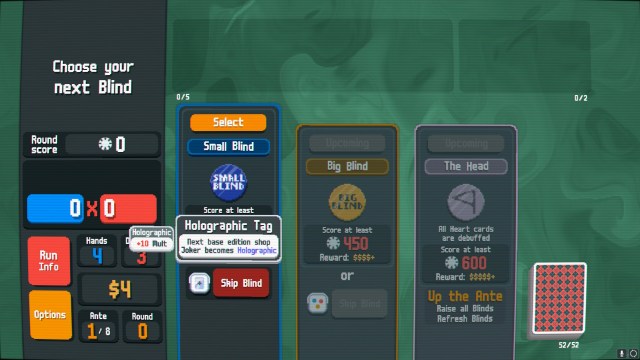 As a new player, it’s tempting never to skip a Blind as you earn cash for winning rounds. However, you earn Tags for skipping, which can be game-changing. Tags can give you free Card Packs and powerful bonuses that can secure the entire run. Make sure you check the available Tag before a match (pictured above), as the bonuses can be far more beneficial than a small chunk of change.