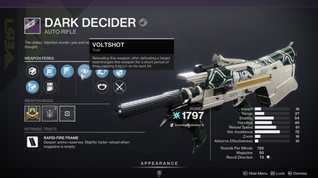 For PvP you’ll need to pack an Arc weapon with the Voltshot perk. This perk makes it so that reloading a weapon after defeating a target will cause it to jolt the next target it hits. And doing this will let you become Amplified. So you’ll get yet another method to score the movement speed buff. There are about 14 weapons in Destiny 2 that can come with Voltshot, but among the best are the IKELOS_SMG_v.1.0.3, the Dark Decider, and the Prodigal Return.