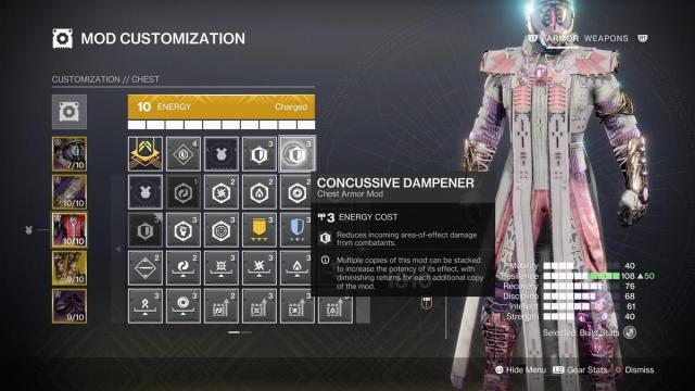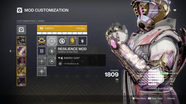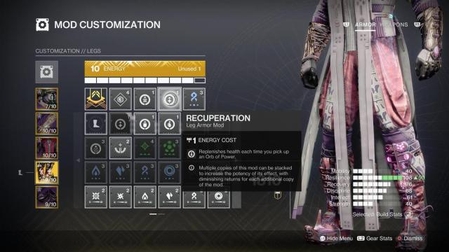 If your Resilience and Recovery are already really high, you want to focus on grenade or melee, or you’re playing Hunter and want high Mobility to get your Dodge back faster, then go with the Discipline, Strength, or Mobility Mods.