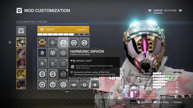 - Helmet – Discipline Mod, Strength Mod, Mobility Mod, Dynamo