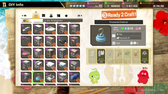 You should regularly review the blueprints you have available, to see if something new and efficient is at your disposal. You can also find a few blueprints back on the mainland. Highlights include the valuable Ornamental Snake Jar, acquired by talking to an NPC at the Anaconda Shopping Center. The blueprint for the Gold Armchair, another useful item, is found in a bottle around the island.