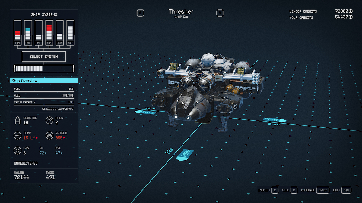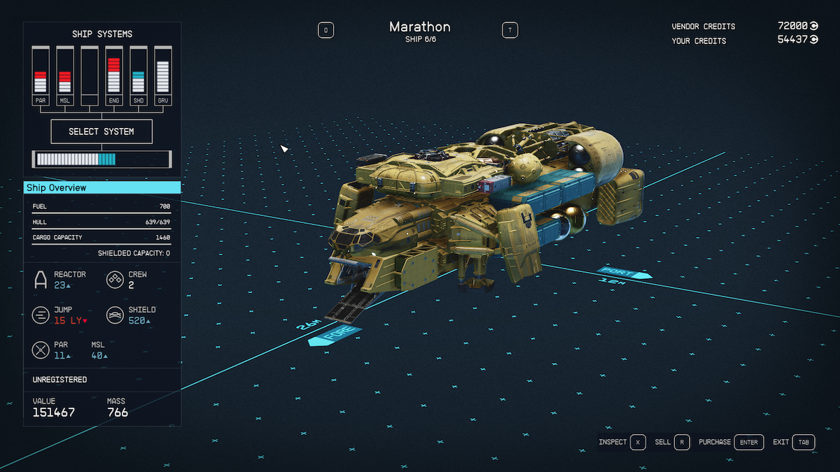 This nimble vessel is impressive for a few reasons such as cargo space and an above-average Grav Drive. Combat-wise, you’ll be fighting in a closed-quarter style, but that shouldn’t deter you since its agility at that range is great. Dodging incoming fire and countering quickly is the name of the game for Marathon. But note that while you can dodge attacks more often, getting hit will be detrimental, so consider upgrading when you can. To purchase this ship, head to the Cydonia Outpost on Mars.