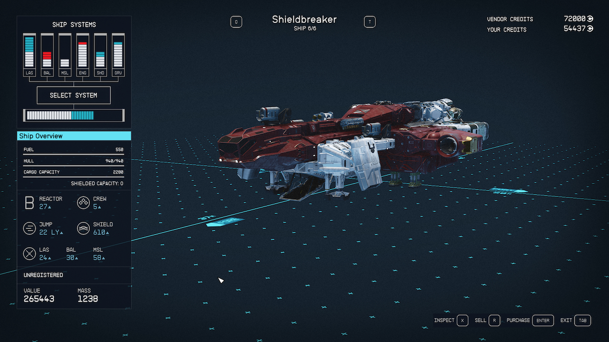 If you’re choosing to play in a passive manner such as exploration, consider looking into the Shieldbreaker. Even though it costs quite a bit in Credits, its price comes with a lot mainly cargo space. As you travel space, and pick up more resources to either hold on to or sell, cargo space becomes even more important. Additionally, it does have great firepower capabilities, so while rather slow, the Shieldbreaker can defend itself quite well. After you save up enough Credits go to the Spaceport and New Atlantis, it can be bought there.
