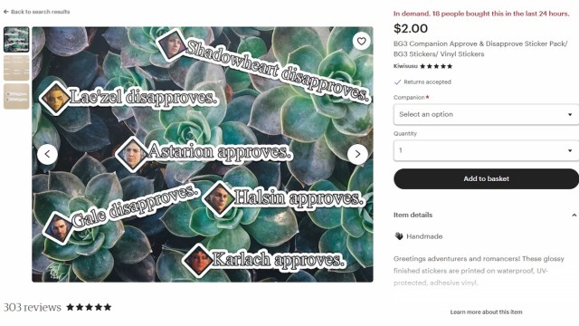 These BG3 Companion Approve/Disapprove Stickers allow you to get a sticker of that in-game pop-up. Choose a companion and whether they approve or disapprove. Luckily, they’re adhesive vinyl, so they’re waterproof and UV-protected.