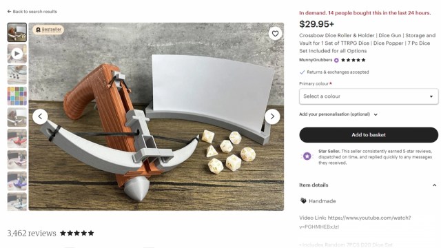 It’s a Crossbow Dice Roller and Holder that lets you lock-and-load dice into a crossbow, then shoot them to roll. This isn’t a hazard, either, since it comes with a stand that you can aim towards that’ll give your dice a soft spot to bounce off of. Not only that, but you get a random dice set included!