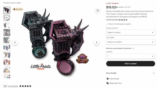 While rolling dice the normal way is easiest, it can get boring after a while. Luckily, D&D fans like to create and purchase things called dice towers that can make rolling so much more enjoyable. This Wyvern Dice Tower and Tray Set is a beautiful tower with a Wyvern clutched to the side of it.