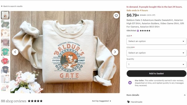 Customize the size and color, or just decide to get it as a t-shirt. I’d recommend the cream-colored one, just because it meshes well with the colors in the print’s design. You can rock your BG3 love without making it obvious that it’s a video game-themed outfit.