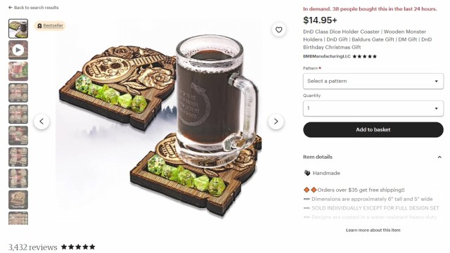 There are patterns available for each class type, as well as general ones with creatures etched into the beautiful wood designs. And if your D&D fan is a dungeon master, there’s a coaster pattern made for them as well. The size is compact enough to fit on a game table at 6″ tall and 5″ wide.
