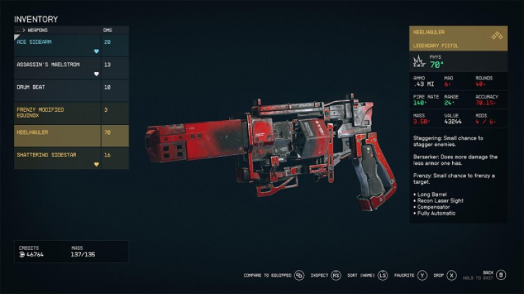 Undoubtedly one of the best weapons in Starfield, the legendary Keelhauler packs a massive punch in a small package. Its impressive physical damage coupled with a blazingly fast rate of fire allows you to drop enemies faster than you can say “unmitigated violence.” What’s more, it also staggers and frenzies enemies, and does more damage the less armoured an NPC is. Although it’s one of the rarest in-game finds, you can receive it easily as a reward by completing the Crimson Fleet side quest “Echoes of the Past.” The best part is this quest lets you net a legendary weapon pretty early in the game. The one from the Crimson Fleet comes fully modded and feels great to wield in close-quarters combat. The only con of this weapon for me is that the type of ammo it uses isn’t quite plentiful, so you’ll need to stock up from a few vendors before putting it to use.