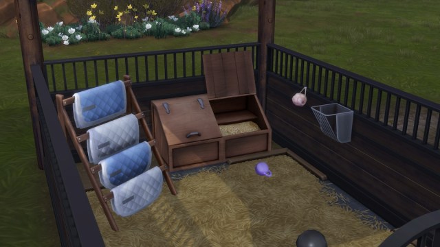 There’s this simple Saddlepad Rack that looks like it holds horse saddles. You can also see this Wall Hay Feeders. In the Expansion Pack, there are a few furniture items, but not enough unique-looking feeders, like this one. Also, your horse will want some of the toys in this Boredom Busters pack. Finally, this amazing Grain Storage Bin has a lot of customization options.