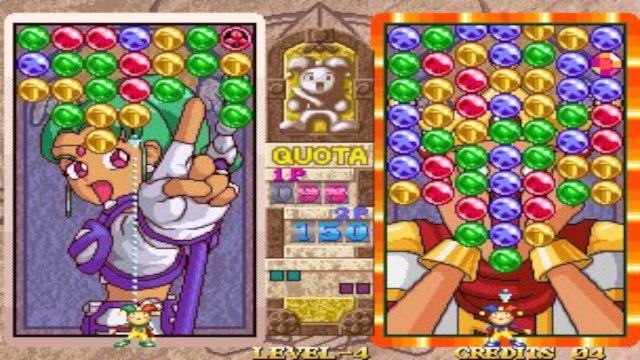 Magical Drop 3 is an addictive puzzle game where you match gems and try to clear your playfield as fast as possible. The better you do, the harder the game becomes for your opponent as their playfield fills with gems faster. Unlike puzzle games like Puyo Puyo or Bust-a-Move, you arrange what’s already on the field instead of adding to it. Rounds are fast-paced as you race to organize your gems into columns, making for intense battles against equally skilled players.