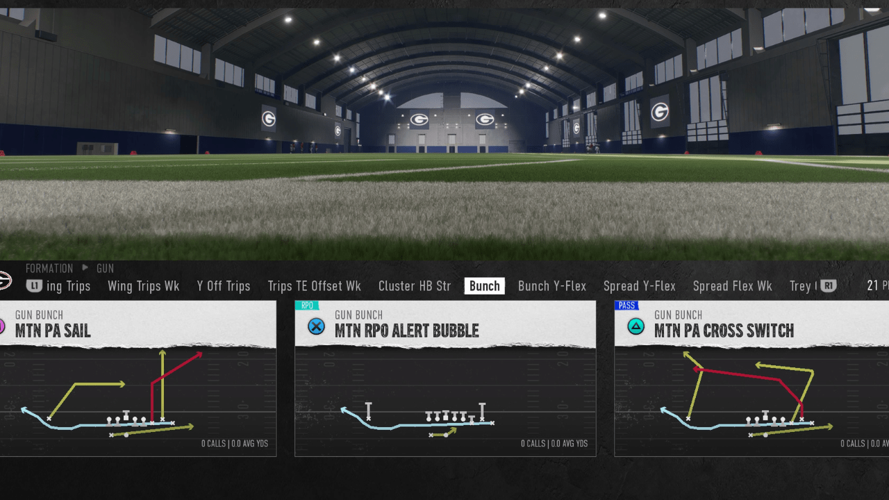 The Georgia Bulldogs playbook has a variety of formations and plays that allow the player to switch up their style between snaps. My favorite plays from this playbook come from Gun which include Duece Close, Double Offset, Trips TE Offset Weak, and Gun Bunch. These include plays that utilize motions but also traditional plays such as Flood, Z-Spot, and Mesh. These are just examples, but each is perfect for the long game and gaining massive yardage.
