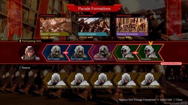 Remember that the Riot Troopers and Grenadiers must be placed side by side for these formations to unlock. Putting the same type of troop next to each other adds a Formation Bonus, which makes your formations even better. You can mix in some standard Security Officers if you don’t want three-star formations in for every step of the parade performance, but remember that easier formations won’t be as impressive and won’t earn you as many points.