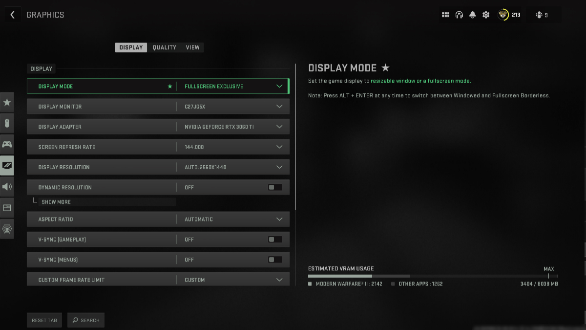 - Display Mode: Fullscreen Exclusive or Fullscreen Borderless