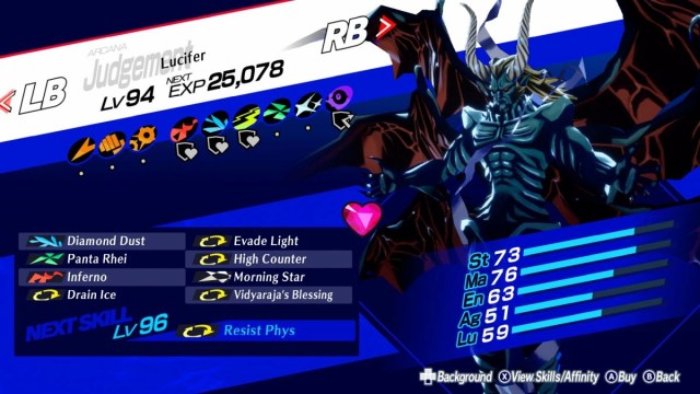 We’re now getting to the most formidable Personas in Persona 3 Reload. Lucifer belongs to the Judgement Arcana and has a minimum level of 89. With 70 points in both Strength and Magic, Lucifer can deal a huge amount of Almighty, Slash, Fire, Wind, and even Ice damage.
