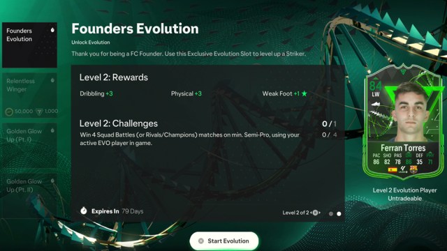 Ferran Torres is already a pretty great card for you to use in the early game of EA Sports FC 24. His versatility and decent card stats make him a great addition, but adding this Founders Evolution to his card makes him a fantastic option. With this Evolution, he gets a five star weak foot, 86 pace, 82 shooting, and 86 dribbling. Combined with his great work rates, four star skills, and his ability to play in multiple positions, Ferran Torres is a top contender for this Evolution in my club.