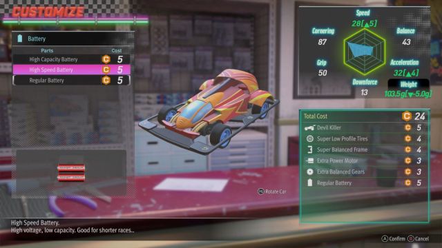 Do all the tweaking you like, but the battery you choose often has the most obvious impact. In races that are sufficiently short without too many tight turns, the High Speed battery is the lead choice. A lot of times, it can be the difference between a win and a loss. I also like the High Capacity battery a lot because it lets me maintain a charge through the end of long races. Sometimes, the High Speed battery just sends me flying off corners, even with all other customizations on point. The High Capacity battery tends to slow me down enough that I have fewer issues. I also like the Regular battery for the less specialized courses. Really, any battery is good, but only one of the three is right for a given course.