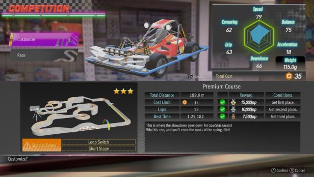 Corners have brutal effect in a close race. You’ll be cruising ahead of your competition just fine, and then you hit a series of S turns and suddenly, you’re behind by a few car lengths. The way to handle this is with the Speed frame, which prevents you from dropping back in those instances. However, there are some courses where the frame sends you flying off the track. In those cases only, I recommend swapping it out for a Balanced frame. I only occasionally had reason to touch the other varieties.