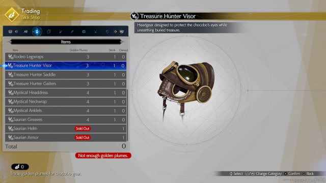 - Treasure Hunter Set: 3 Golden Plumes for each piece at the Tack Shop in Gongaga.