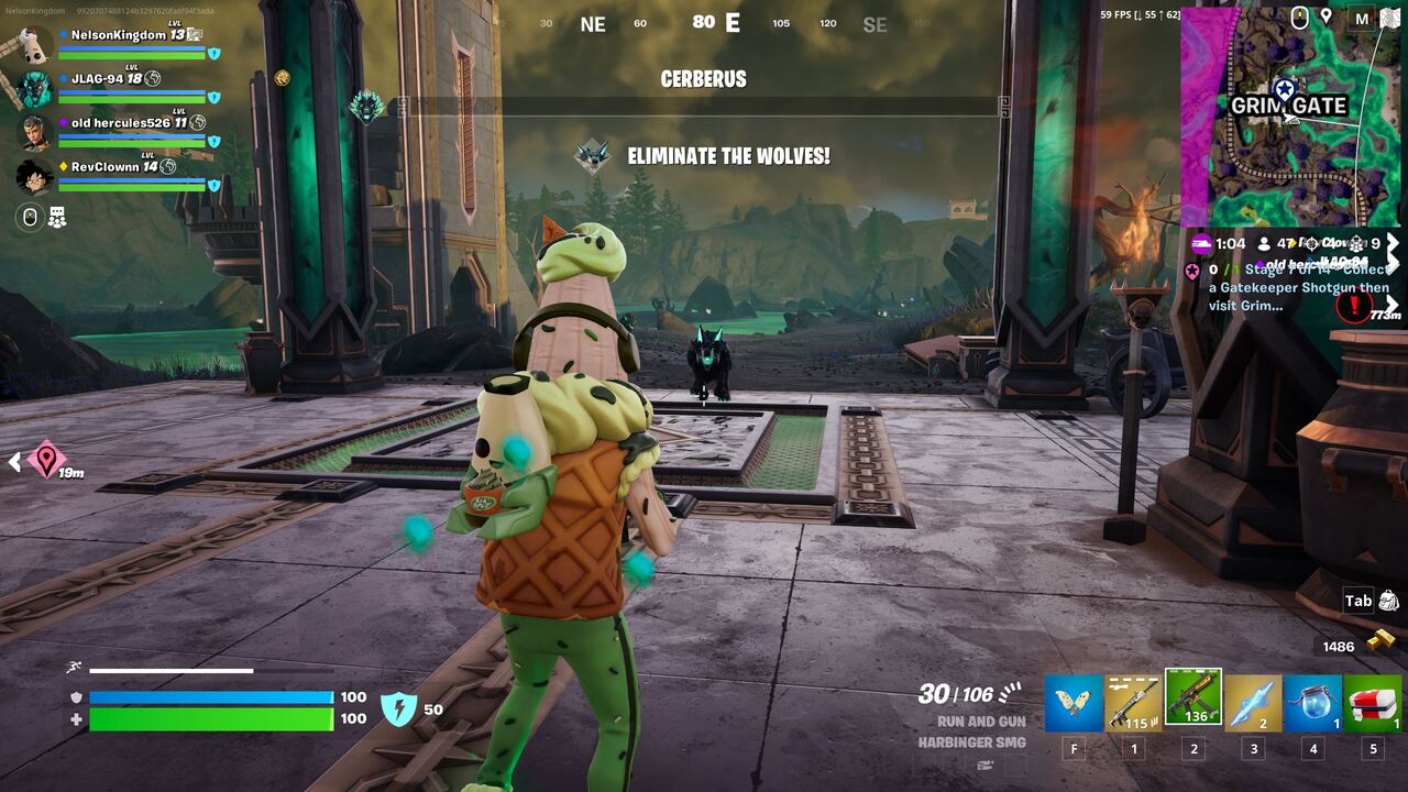 Cerberus is found in Grim Gate, a great POI surrounded by green water that, when entered, gives you Underworld Dash. We’ll be using that to defeat Cerberus.