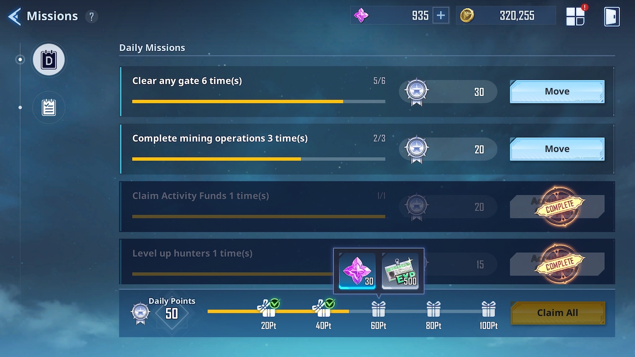 As you can see from the image above, at 60 Points I’ll get 30 Essence Stones, and at 100 I’ll receive even more. Get into the habit of completing your Daily Missions every day.
