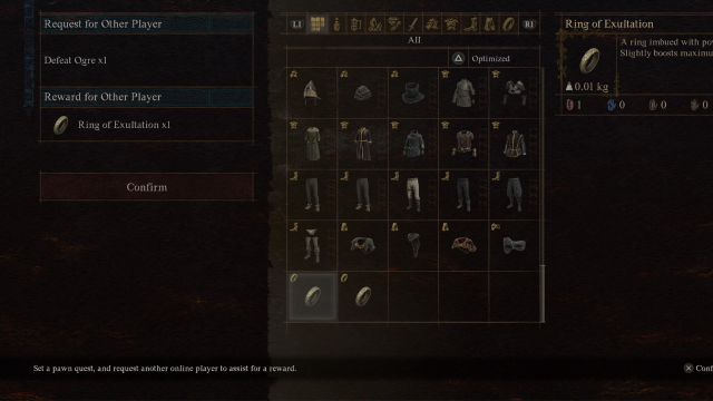 In other words, you need to make sure you set a quest that isn’t too difficult, with a worthwhile reward. Let’s discuss my pawn, for example. Right now, I have a Pawn Quest where you must defeat a Ogre, and in return, I will give you a ring that increases maximum health. That quest is well worth it, especially for players looking to have more of a tank build.