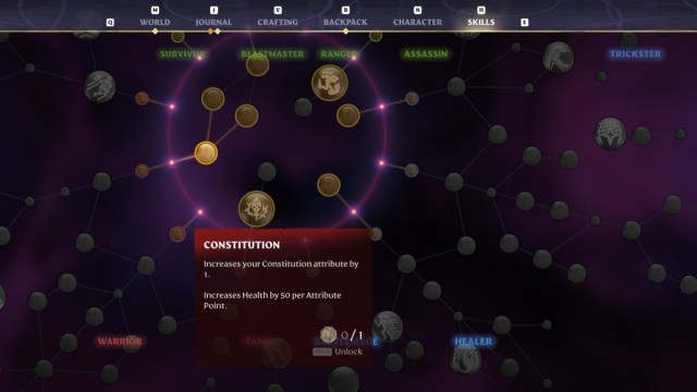 Once you have some skill points, invest in the red skill nodes for the Warrior, Tank, and Barbarian classes in the bottom left of the skill tree. There are several Constitution nodes that will increase your Constitution attribute by one point after unlocking them. Every point you add to Constitution will increase your maximum health by 50.
