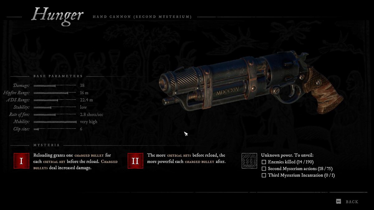 Hunger is the Hand Cannon you start out with, and I absolutely love it because it’s what made me fall in love with Witchfire. It’s sturdy, dealing high damage and holding only six rounds. That said, I prefer Midas, Hailstorm, and even Echo over Hunger, but I’ll take it out from time to time to feel like a headshot king.