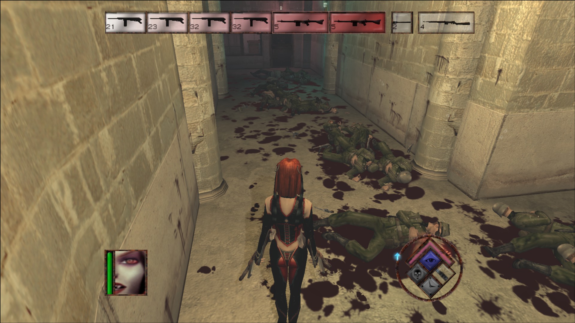 One of BloodRayne: Terminal Cut‘s most unique elements is that Rayne heals by drinking the blood of her foes. You can leap onto any humanoid non-elite enemy at any time and Rayne will drink them dry until they plotz. It kind of makes enemies horribly non-threatening, but it’s a neat power fantasy option. Rayne often needs this to survive, as the enemy she’s feeding on will provide cover. It’s still immensely entertaining to leave a hallway covered with the corpses of a dozen Nazis after feeding your way through them. Rayne can also slow down time, which massively helps with keeping her alive.