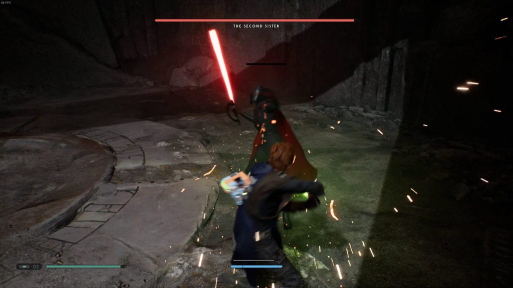 The Second Sister isn’t fooling this time around. Your first encounter with her was more or less a boss tutorial. This time you have some experience under your belt, and she comes at you as a full-fledged boss — well, more or less, but we’ll get into that later. Countering her attacks is pivotal in this fight, and hopefully at this point in the game you have done some practice. She charges you right off the bat, swinging fast and hard. Parrying each lightsaber blow allows you to whittle down her defensive meter for a couple swift attacks.
