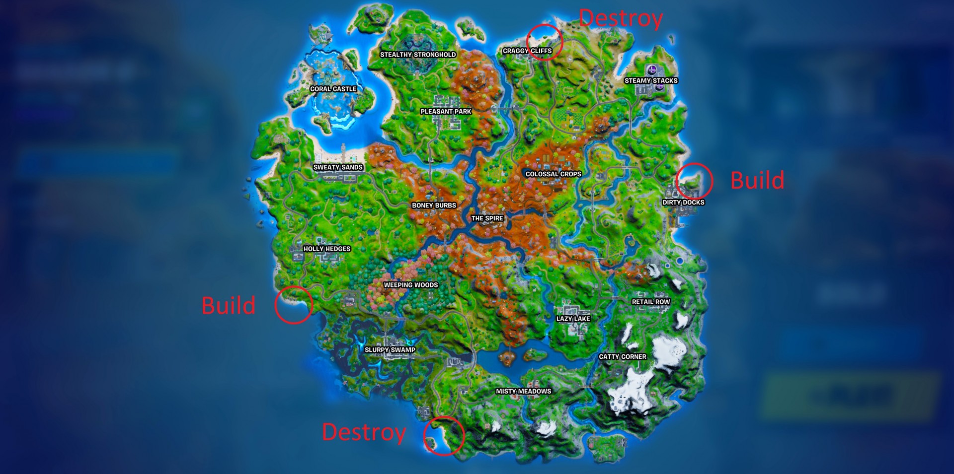 When you have built the sandcastles, you will want to move on to the next part of the challenge which tasks you with destroying them. Destroying sandcastles in Fortnite can be done at the beach to the northeast of Craggy Cliffs, or the beach south of Flush Factory. If you visit the beach near Craggy Cliffs, you will find ready built sandcastles by the parasols near the coast. Then, you can destroy them by simply holding the destroy prompt when you approach them. Similarly, you can make your way to the beach to the south of Flush Factory, close to the new Isla Nublada island. Performing the same action once you have spotted the sandcastles near the striped canopy will also mark the challenge as complete.